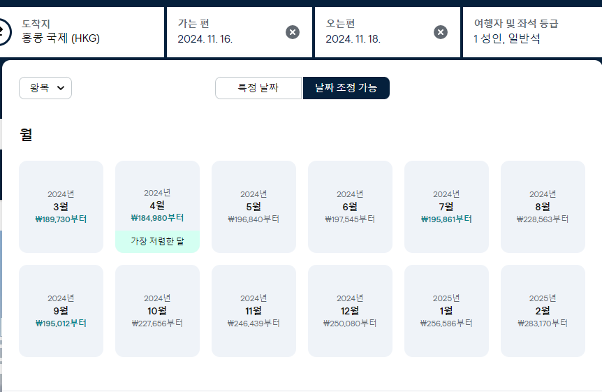 날짜 조정가능을 선택하면 해당 목적지의 월별 가격대를 볼 수 있어요.